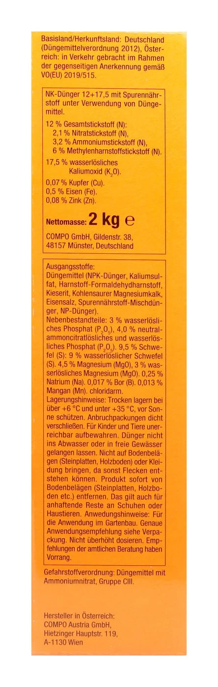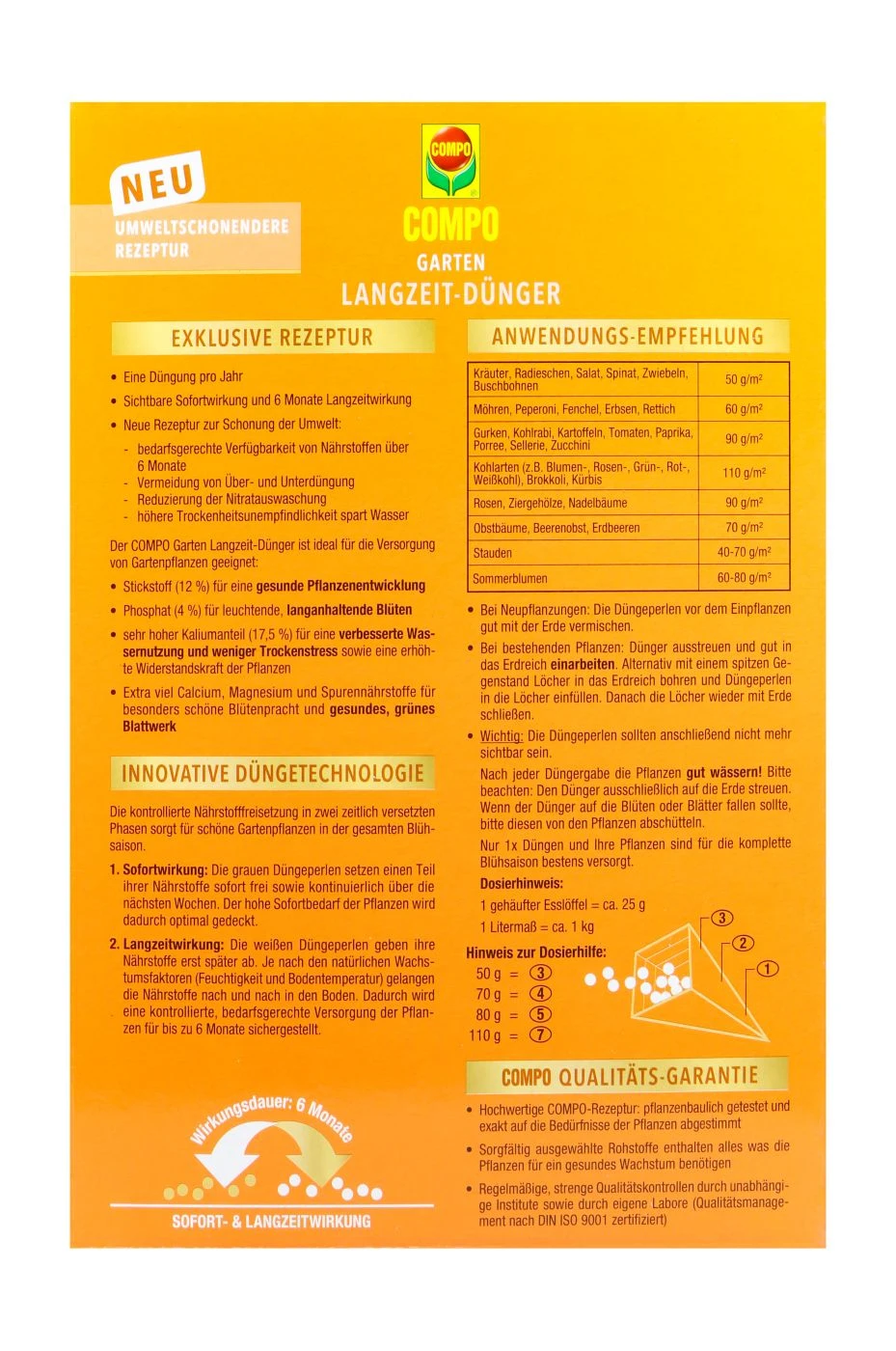 Ein Star unter den Düngemitteln! Der Compo Garten Langzeit-Dünger ist ein Allround Talent. In ihm stecken eine Vielzahl an Spurenelementen und Nährstoffen, durch die sich deine Pflanzen kräftig und gesund entwickeln. Zuerst werden die grünen Patienten sofort mit den wichtigsten Nährstoffen versorgt und anschließend langfristig immer wieder mit dem Folgebedarf eingedeckt. Und das für bis zu 6 Monate, sodass einmal düngen für eine Saison ausreichend ist.