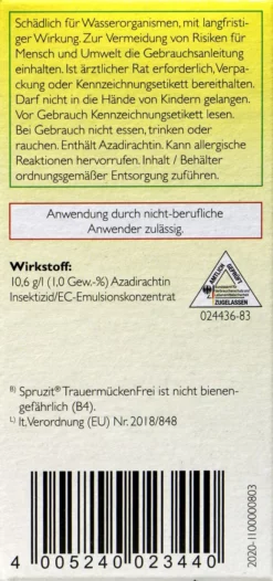 Neudorff Spruzit TrauermückenFrei nutzt genau diese Wirkstoffe, um gegen zahlreiche saugende und beißende Insekten vorzugehen. Neem wirkt sich auf die Wachstumsregulatoren der Larven aus und unterbindet die Entwicklung zu einem ausgewachsenem Insekt.
