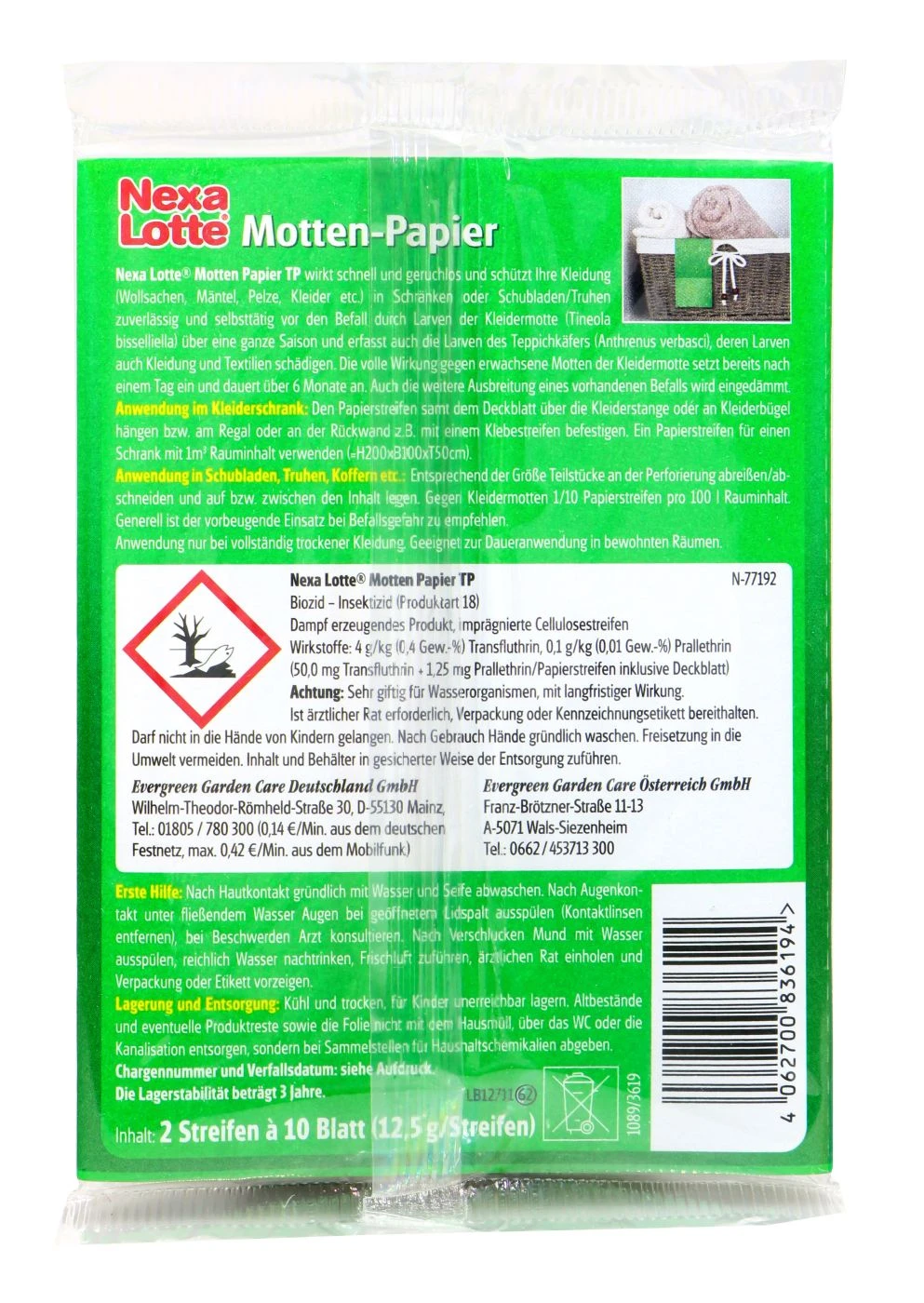 Der Mottenschutz wirkt bis zu 6 Monate und ist auch gegen Pelzkäfer geeignet.